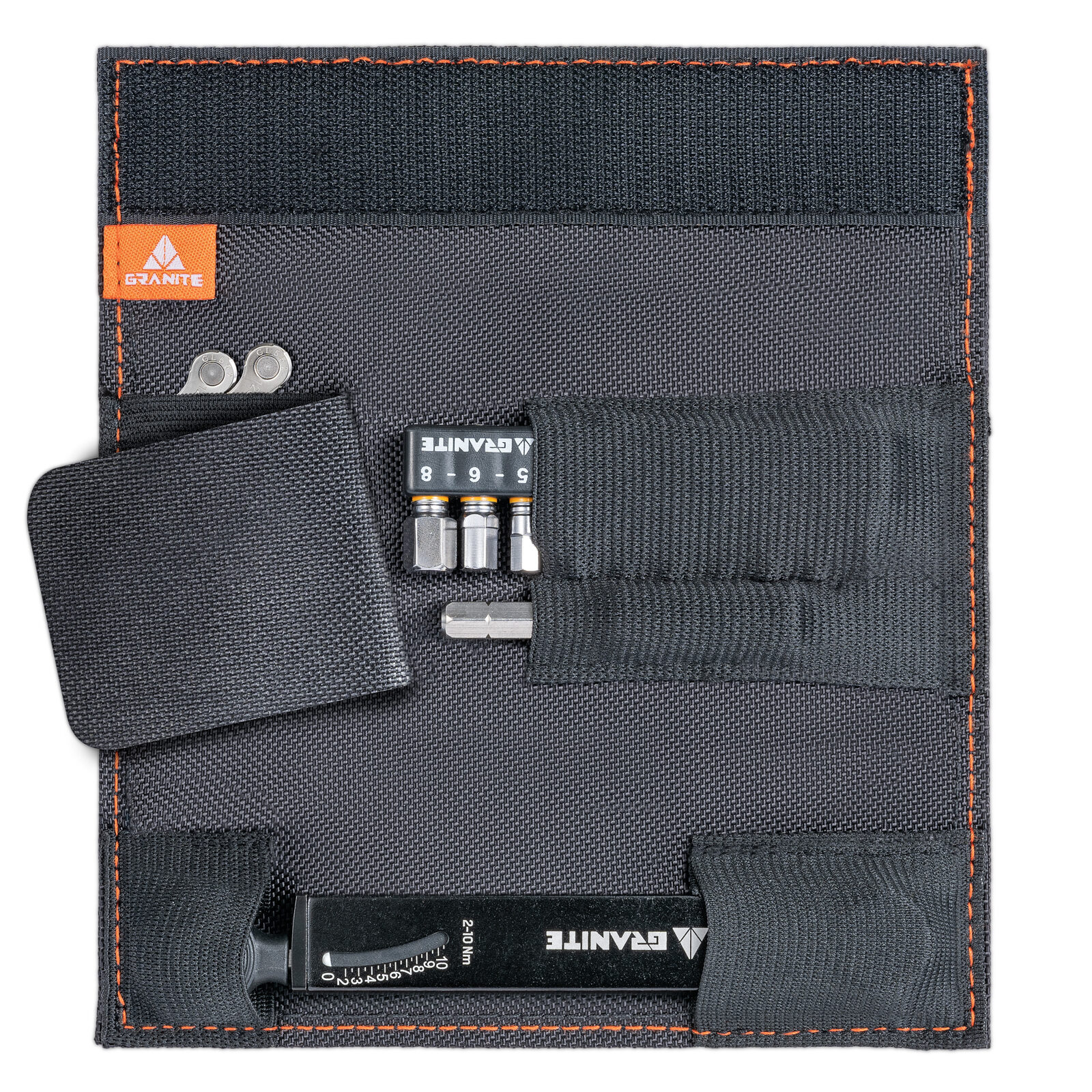 Er enthält 10 Bits von 2 bis 8 mm Hex, T20, T25 und PH2 sowie eine Verlängerungsstange für schwierige Stellen. Das Set verfügt ausserdem über eine elastische Tasche für kleine Gegenstände und ist in einer strapazierfähigen 600D-Polyestertasche mit einer Schlaufe für den Rockband-Trageriemen untergebracht.