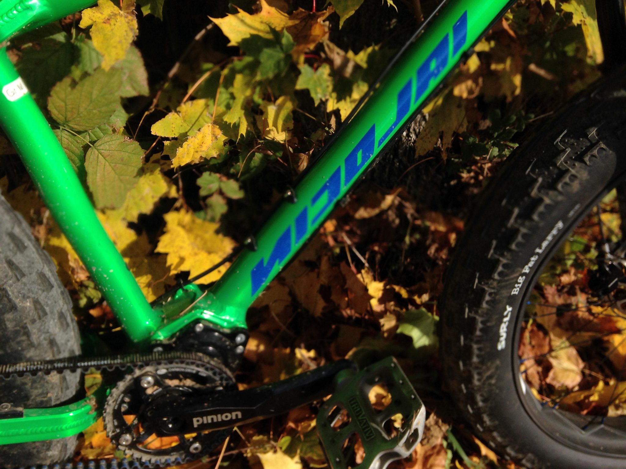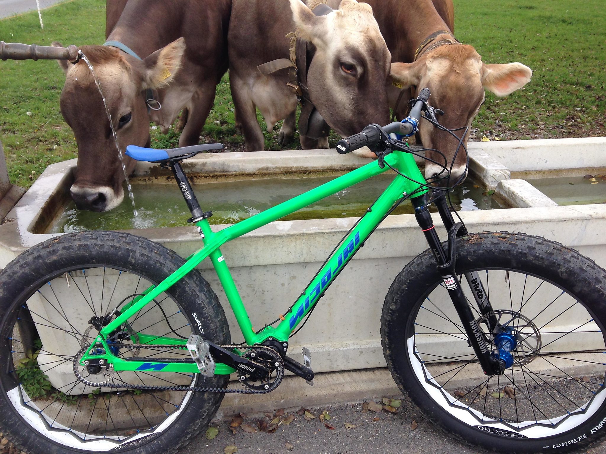 KOMPLETTBIKE PINION-GATES-ANTRIEB, Farbe Pulver semipermeable green glaze, mit Tune FAT Skyline Laufräder mit Enso686 Carbon-Felgen, elGallo, Reset, Sram, Surley, RockShox Bluto 120mm
