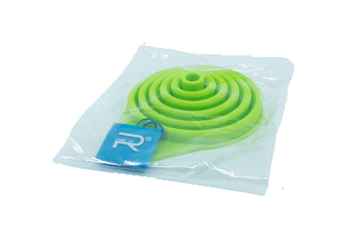 Der Silikontrichter von Risk iT ist die praktische Lösung für nachhaltiges Nachfüllen und überzeugt durch seine kompakte Bauweise und einfache Handhabung.